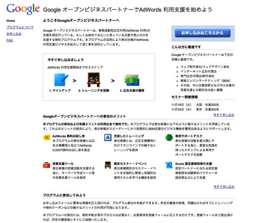 Google は本日、中小の広告主様の AdWords 利用支援を行う企業をサポートするプログラム、Google オープンビジネスパートナーを開始いたしました。このプログラムを通じ、中小の広告主様には個々のニーズに沿った AdWords ご利用の支援提供を、また、プログラム参加者様には AdWords 利用支援という新たなビジネス機会の提供を目指します。